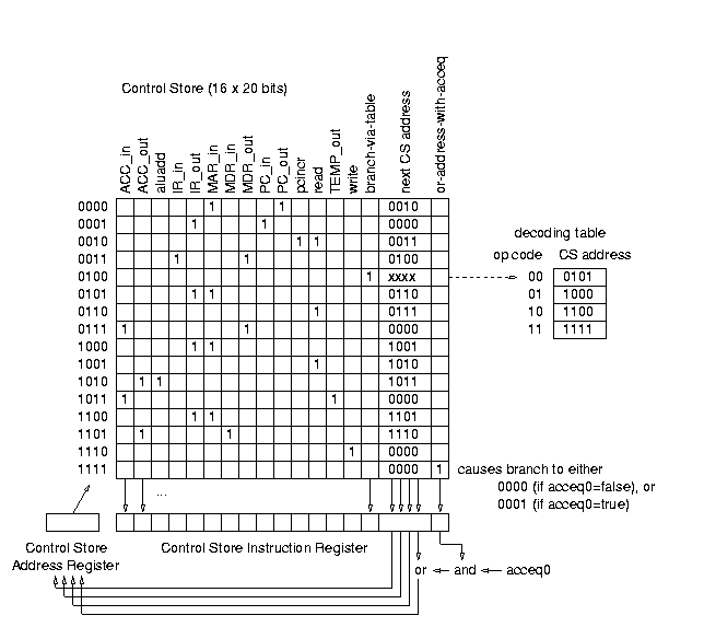 这六个位包括一个四位的下一地址字段和一个一位的覆盖信号(通过表分支),该信号导致从单独的解码表中加载下一地址,而不是使用下一地址字段。在这个例子中,解码表由指令寄存器中的两位操作码字段索引,并提供与该特定操作码相关联的微程序在控制存储器中的入口点地址。